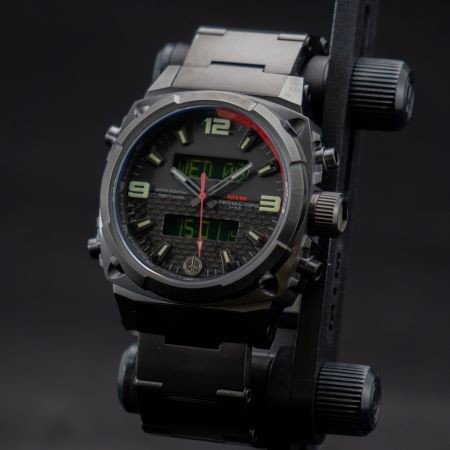 時間/日、5つのアラーム、グローバルGMT世界時計、24時間表示、クロノグラフ、ストップウォッチ、デジタルコンパスとエレクトロルミネセンスバックライト付き多機能モードデジタルディスプレイ。