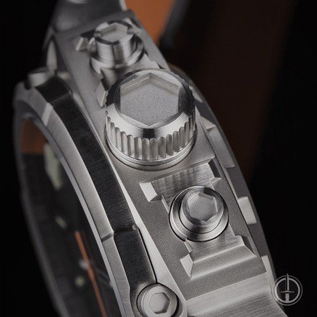 真鍮とカーボンファイバーの複合素材ダイヤルと、Black、SilverまたはGrey仕上げソリッドチタンのケース。